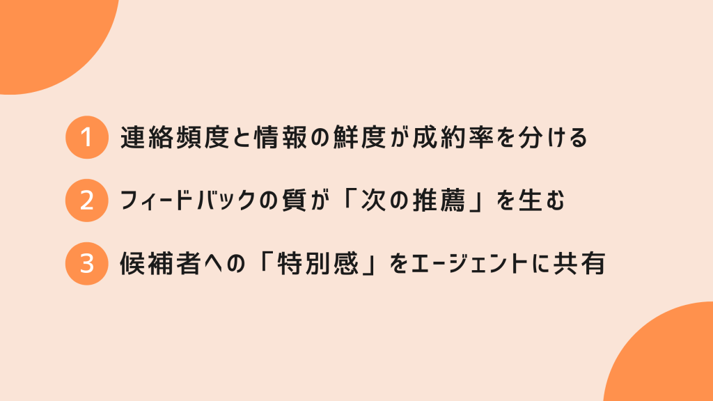 合否連絡や日程調整の速さは、エージェントに対する最大の敬意です。「この会社は対応が早いから、安心して候補者を任せられる」という信頼が、推薦の優先順位を押し上げます。