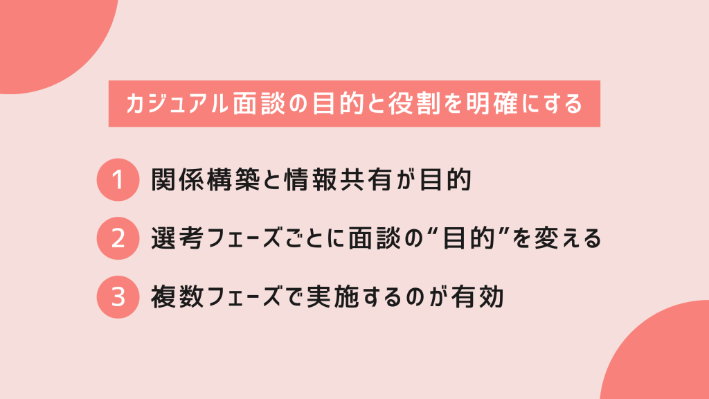 カジュアル面談は「ただ話す場」ではなく、候補者との信頼関係を築き、志望度を高めるための戦略的な接点です。ここでは、その本来の役割や果たすべき目的について、採用成功企業の共通点を踏まえながら整理していきます。
