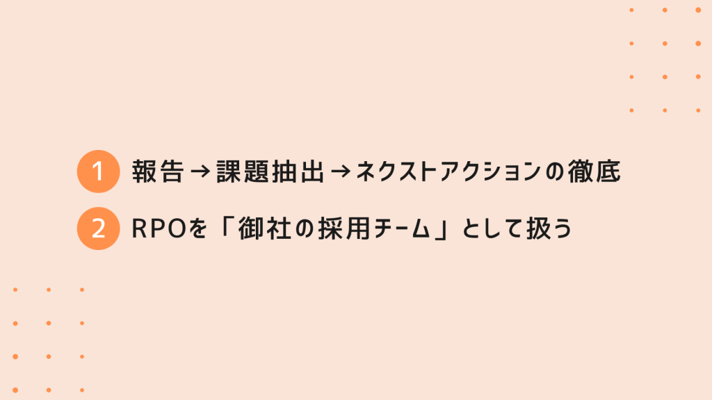 「持ち帰って検討します」を極力なくし、その場でPDCAを回すことこそが、RPO運用を成功させる最大のコツです。