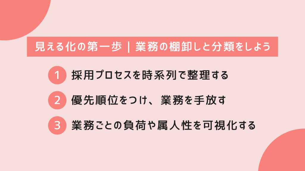 採用業務の「見える化」を進めるうえで、最初に取り組むべきは業務の棚卸しと分類です。
