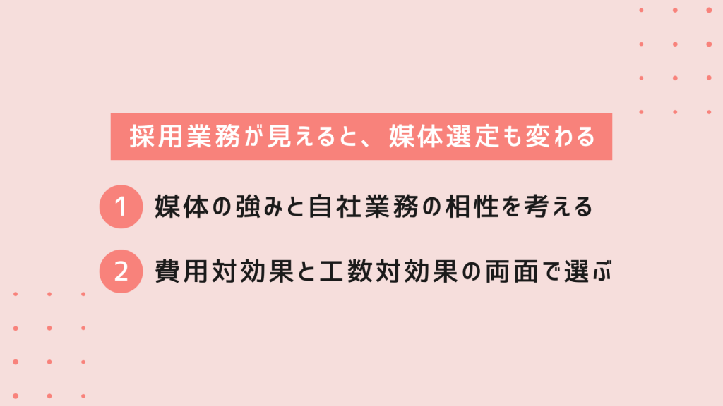 このように整理することで、自社のリソースや予算に合った媒体を選びやすくなります。「広告費が安い」「応募が多い」といった一面的な基準ではなく、トータルコストと工数負荷を総合的に比較することが、媒体選定を失敗しないコツです。