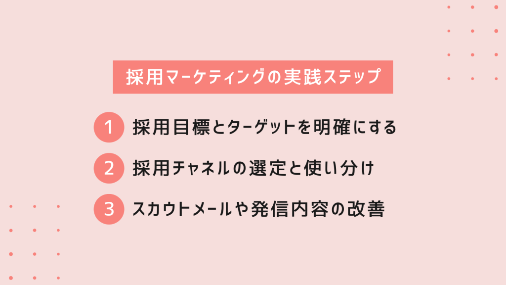 この章では、実際に企業が採用マーケティングを取り入れる際に押さえるべき基本ステップを解説します。現場で“すぐに使える”視点を意識しながら、戦略を行動に落とし込むプロセスを見ていきましょう。