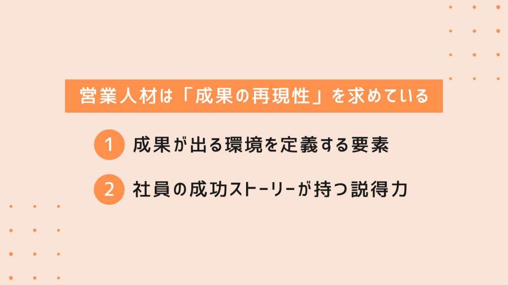 営業人材を惹きつけるには、「ここで自分も成果を出せそう」と思わせることが重要です。