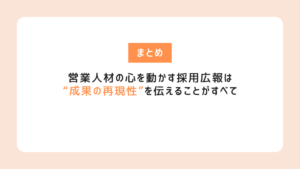 こうした要素が整っていることを、採用広報で「構造」として言語化し、具体的に示すことで、営業人材の「この会社でなら自分の強みを発揮できそうだ」という納得感を醸成できます。