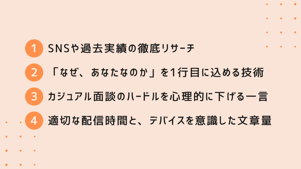「その他大勢へのスカウト」ではなく、「あなた個人への招待状」であることを、冒頭の数秒で確信させることが重要です。