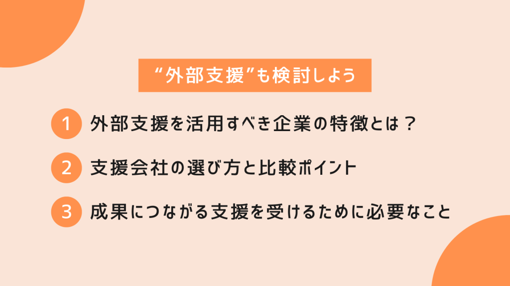 これらを踏まえると、「社内に時間・人材・ノウハウのいずれかが不足している企業」は、外部支援を前提とした体制構築を視野に入れるべきと言えるでしょう。